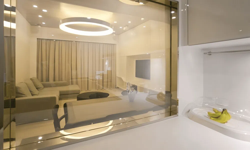 Además, la película inteligente se integró en el sistema de iluminación de la sala, garantizando una privacidad óptima sin comprometer la luz natural durante el día.